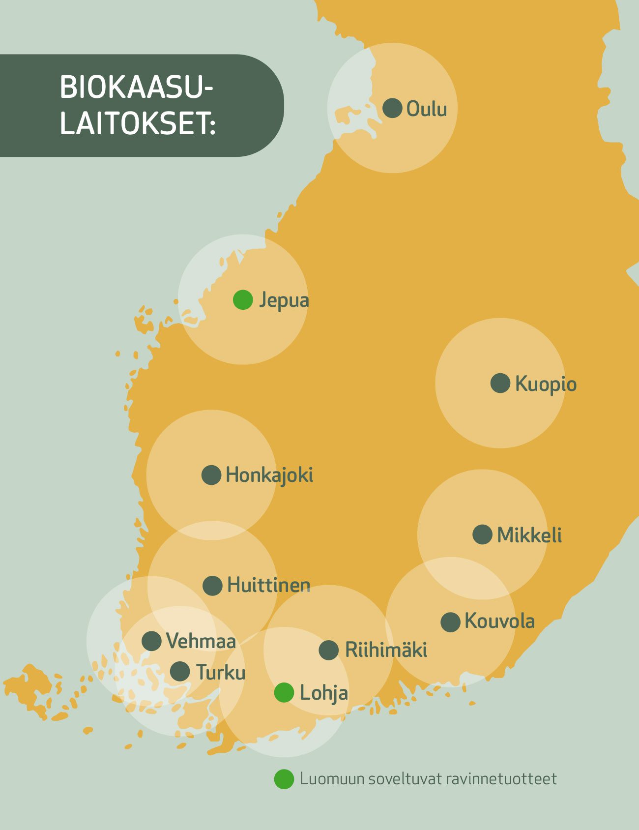 Tuotteemme ovat vastuullisia, kiertotalouteen pohjautuvia ravinneratkaisuja maanviljelyyn. Tuotevalikoimastamme löytyy broilerinlantapohjaisia kierrätyslannoitteita sekä biokaasulaitoisten sivutuotteina syntyviä orgaanisia lannoitetuotteita. Kaikki lannoitteemme ovat suomalaista alkuperää. Valikoimaamme kuuluu Gasumin, Metsäsairilan ja Jeppo Biogas:in biokaasulaitosten tuottamat lannoitteet.